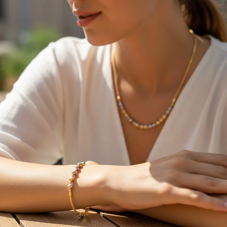 Uğur Kuyumculuk’un zarafet ve usta işçiliğiyle hazırlanan dorikolu altın set; kolye ve bileklikten oluşan uyumlu tasarımıyla şıklığı sade ve güçlü bir çizgide sunar. Dorika topların parlak dokusu ve klasik görünümü, sete zamansız bir zarafet kazandırırken her kombinle uyum sağlayan estetik bir duruş oluşturur. Günlük kullanımdan özel davetlere kadar her ortamda rahatlıkla tercih edilebilir.